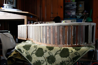 I'm happy to have a great start on the upright, reminding me at times of a Viking ship and at others of an old hot rod. Below is a shot of the sitka spruce top. I've burnt in the soundhole outlines which will fair better than pencil marks with all the sanding that still needs to happen.